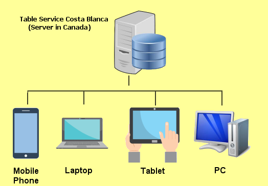 Application Overview TableService Costa Blanca works on any device, mobile phone (with or without SIM), tablet, laptop, workstation or smart TV.
